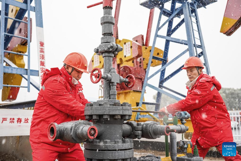 Trabajadores laboran en la nieve en el Yacimiento Petrolífero de Daqing, en Daqing, en la provincia de Heilongjiang, en el noreste de China, el 15 de octubre de 2025. Una nevada afectó parte de Heilongjiang el miércoles. (Xinhua/Ma Ke)
