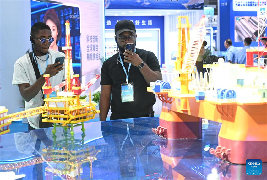 Dos participantes toman fotografías de las exposiciones en la Conferencia Mundial de Equipos Marítimos 2025 en Fuzhou, el 16 de octubre de 2025. (Xinhua/Zhou Yi).