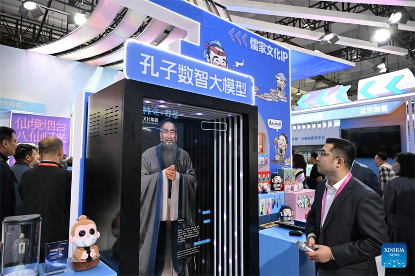 Un visitante observa una imagen de inteligencia digital de Confucio en la décima Exposición Internacional de Derechos de Autor de China en Qingdao, el 16 de octubre de 2025. (Xinhua/Li Ziheng).
