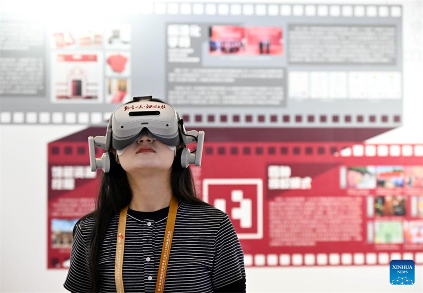 Una asistente prueba un dispositivo de realidad virtual en la décima Exposición Internacional de Derechos de Autor de China en Qingdao, el 16 de octubre de 2025. (Xinhua/Li Ziheng).