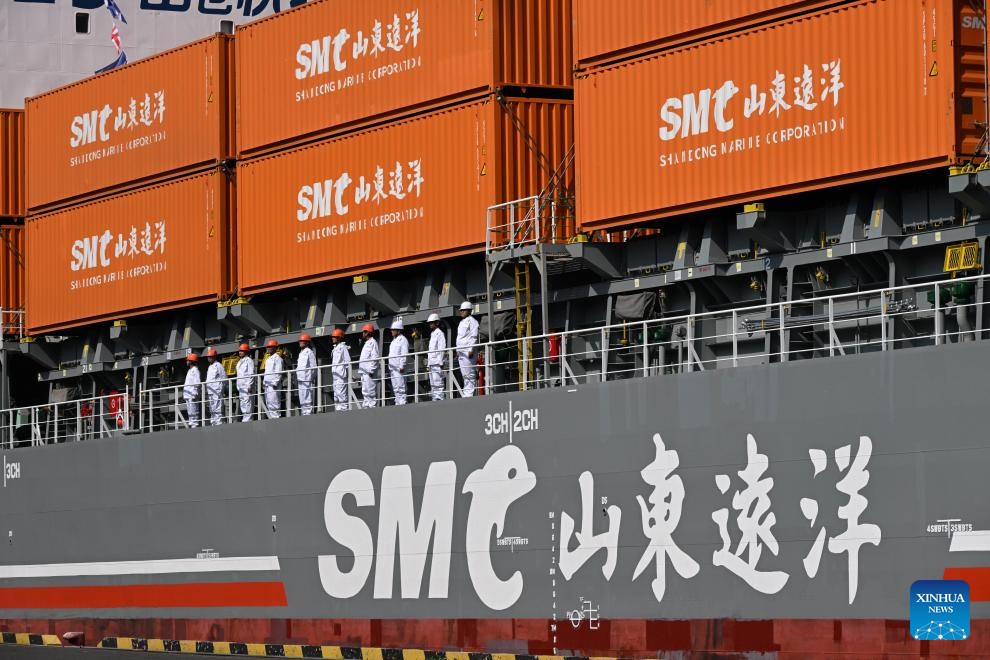 Tripulantes del buque "SMC RIZHAO" que realiza el viaje inaugural de la ruta de envío de contenedores Qingdao-Jeju se alinea en la cubierta de la Terminal Internacional de Cruceros de Qingdao, en Qingdao, en la provincia de Shandong, en el este de China, el 16 de octubre de 2025. El jueves se inauguró una ruta regular directa de transporte de contenedores entre Qingdao y Jeju de República de Corea. (Xinhua/Li Ziheng)