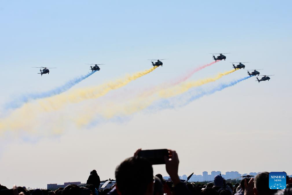 Helicópteros del equipo de acrobacias aéreas Fenglei del Ejército Popular de Liberación de China realizan una presentación durante la séptima Exposición de Helicópteros de China, en la municipalidad de Tianjin, en el norte de China, el 18 de octubre de 2025. La exposición abrió sus puertas al público general el sábado. (Xinhua/Li Jie)