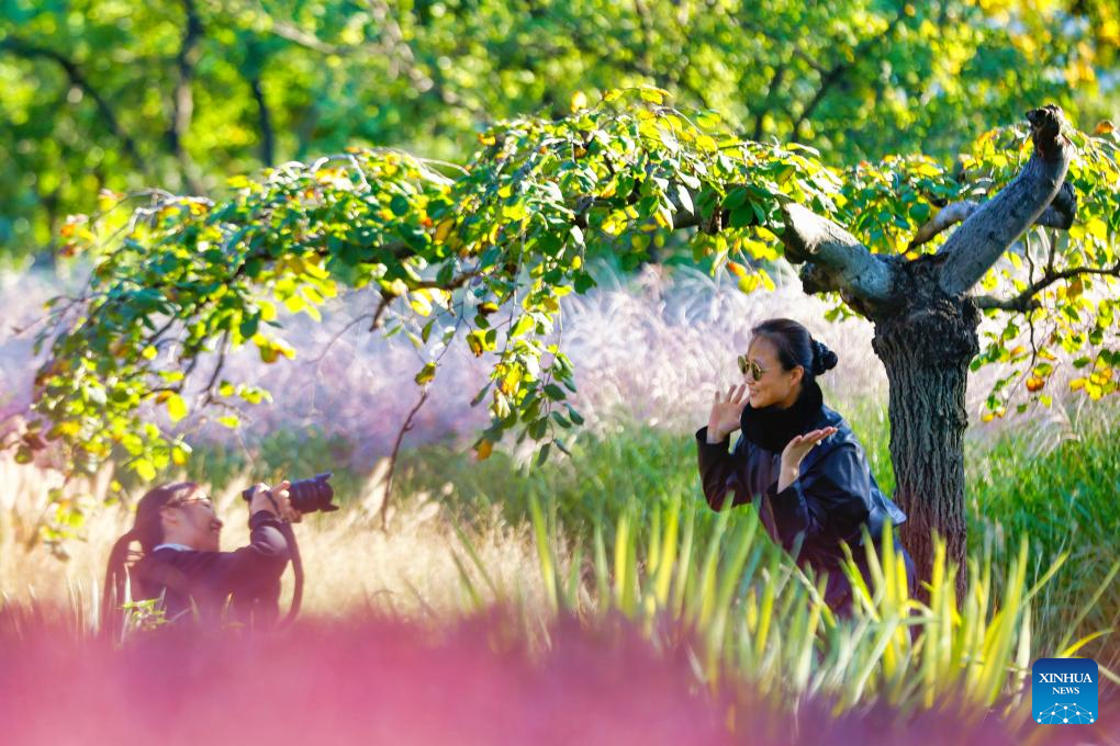 Una mujer posa para unas fotos en un jardín botánico en la Nueva Área de Binhai, Tianjin, norte de China, el 19 de octubre de 2025. (Foto de Du Penghui/Xinhua).