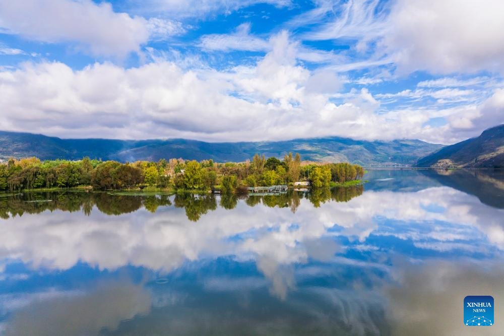 Una foto aérea de dron tomada el 18 de octubre de 2025 muestra el paisaje de un lago en el distrito de Eryuan, prefectura autónoma de la etnia bai de Dali, provincia de Yunnan, suroeste de China. (Foto de Luo Xincai/Xinhua).