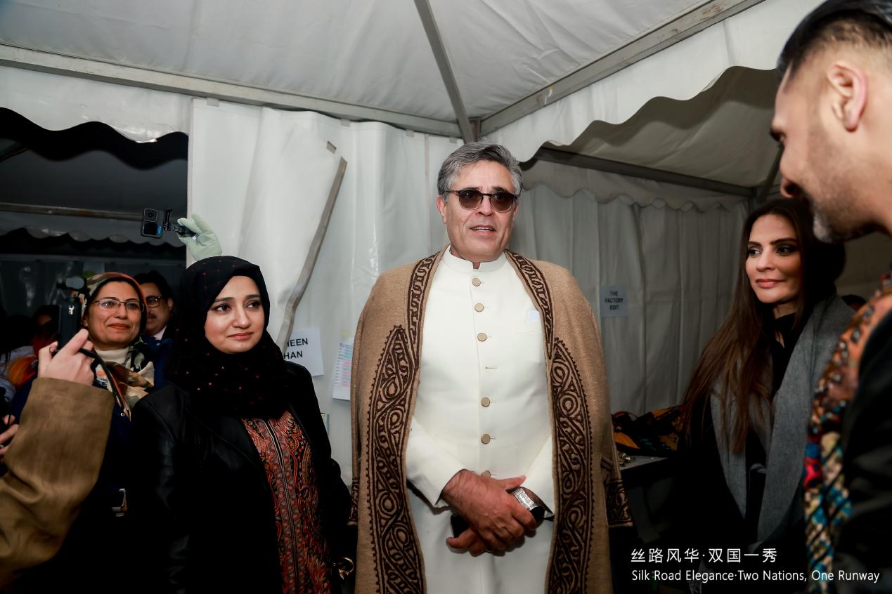 Khalil Hashmi, embajador de Pakistán en China, habla con diseñadores entre bastidores en el Desfile de Moda Pakistán-China en Beijing, el 19 de octubre de 2025. (Foto proporcionada por la organización).