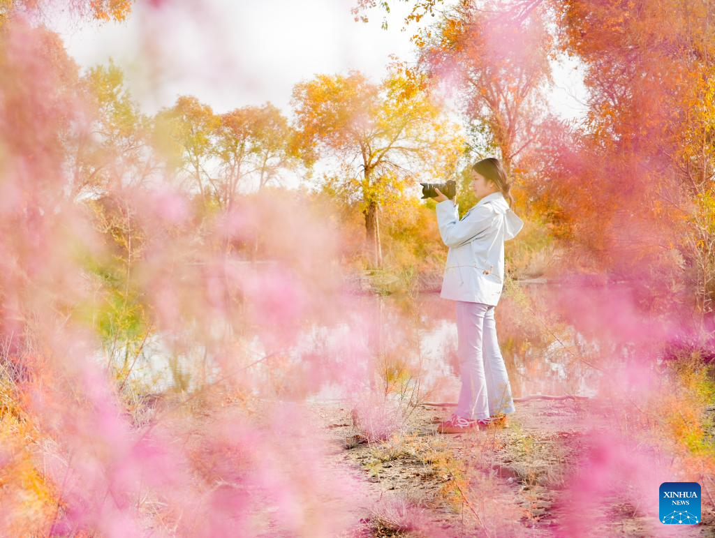 Una turista toma fotos en un bosque de álamos en el distrito de Yuli, prefectura autónoma de la etnia mongola de Bayingolin, en la región autónoma uigur de Xinjiang, noroeste de China, el 13 de octubre de 2025. (Foto de Wang Zhipeng / Xinhua).
