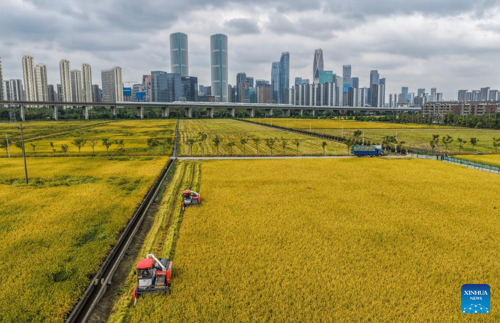 Imagen tomada con un dron el 21 de octubre de 2025 de cosechadoras recolectando arroz en un arrozal, con un tren de alta velocidad al fondo, en Hangzhou, en la provincia de Zhejiang, en el este de China. (Xinhua/Xu Yu)