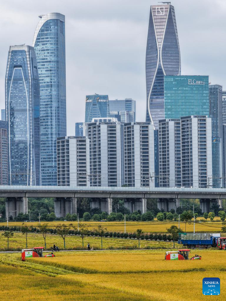 Imagen tomada con un dron el 21 de octubre de 2025 de cosechadoras recolectando arroz en un arrozal, en Hangzhou, en la provincia de Zhejiang, en el este de China. (Xinhua/Xu Yu)