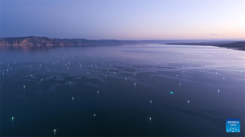 Una foto de dron tomada el 17 de octubre de 2025 muestra atrayentes luminosos para pesca en la zona de la Garganta de Longyang, en el distrito de Gonghe de la prefectura autónoma de la etnia tibetana de Hainan, provincia de Qinghai, noroeste de China. (Xinhua/Qi Zhiyue).
