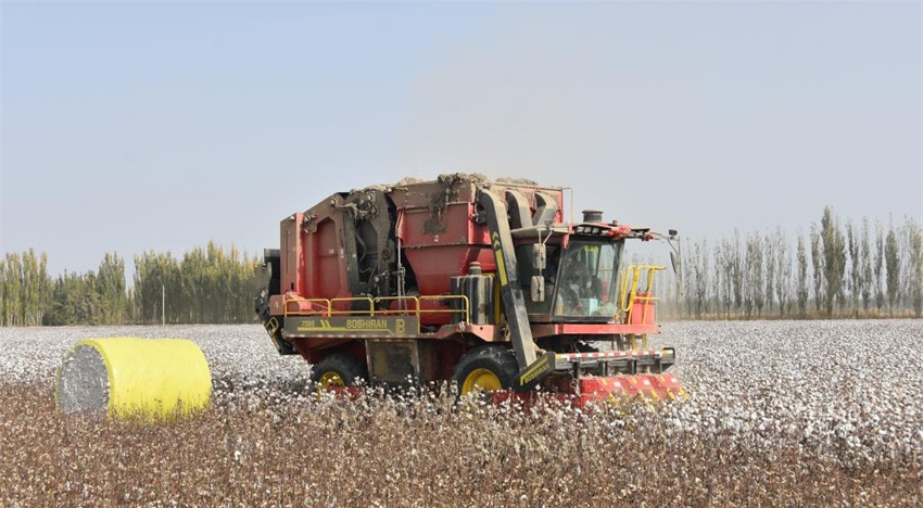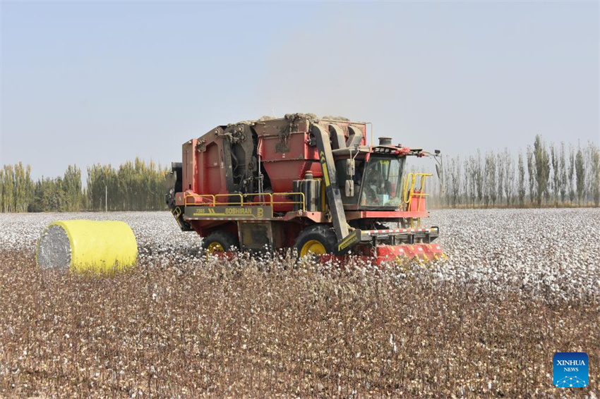 Una cosechadora de algodón opera en un campo en el distrito de Xayar de Aksu, en la región autónoma uigur de Xinjiang, noroeste de China, el 21 de octubre de 2025. La temporada de cosecha de algodón ya ha dado comienzo en dicho distrito. (Xinhua/Jia Zhao).