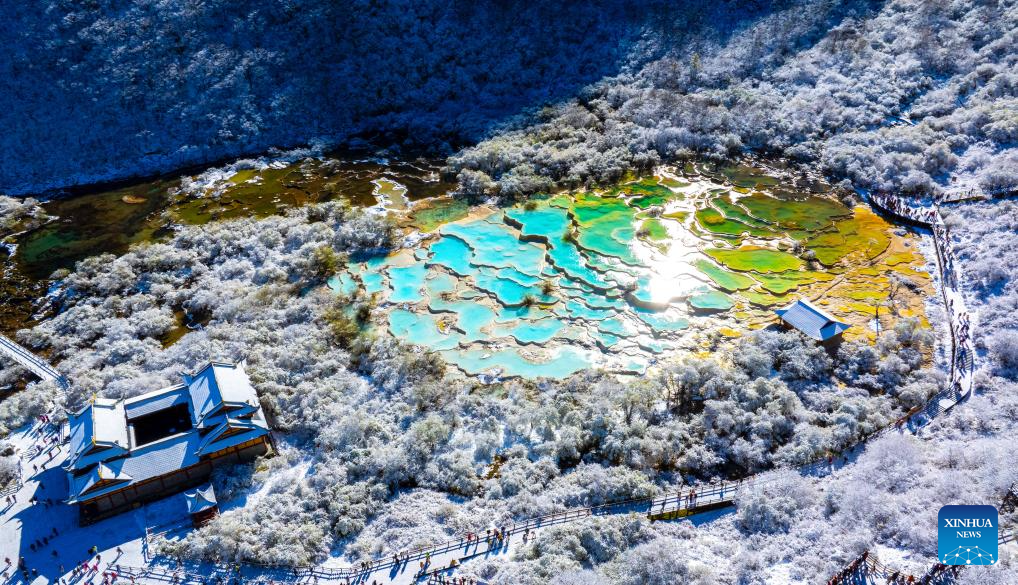 Una foto aérea tomada con dron el 21 de octubre de 2025 muestra una vista del conjunto de estanques coloridos después de la nevada en el valle de Huanglong. (Foto de Sun Jiapeng/Xinhua).
