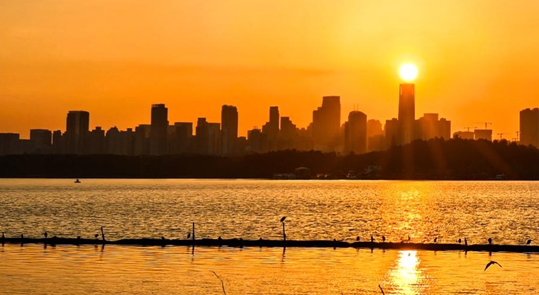 Esta foto tomada el 22 de octubre de 2025 muestra el lago Donghu al atardecer en Wuhan, provincia de Hubei, centro de China. (Xinhua/Shen Hongbing).