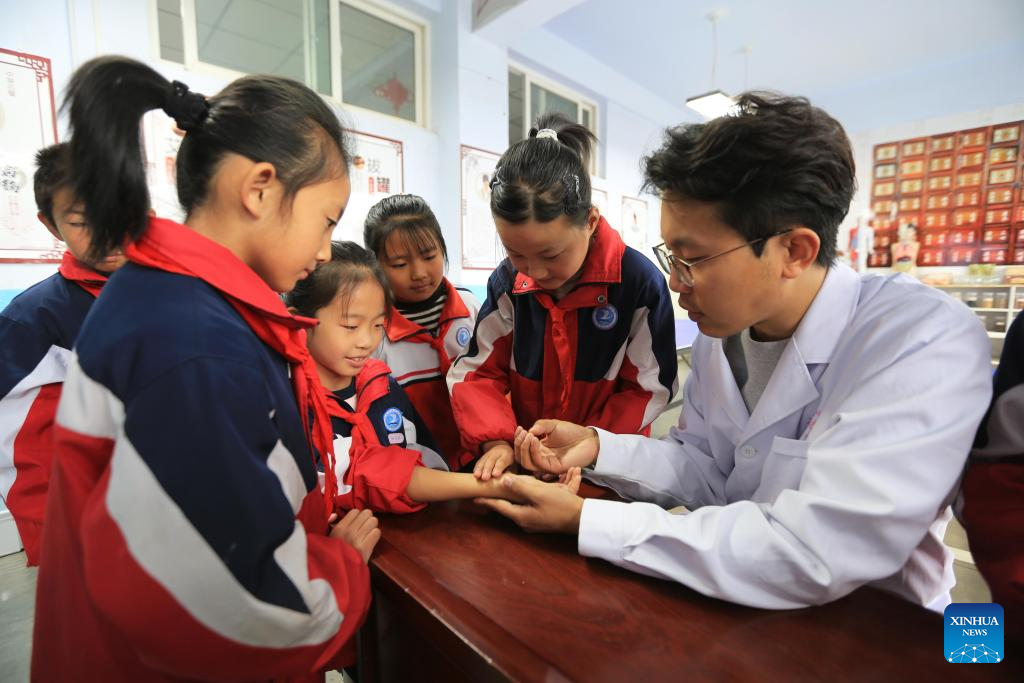 Un médico guía a los estudiantes para que experimenten el diagnóstico del pulso en una escuela primaria, en el distrito de Anding de la ciudad de Dingxi, en la provincia de Gansu, en el noroeste de China, el 22 de octubre de 2025. Clases sobre la medicina tradicional china fueron impartidas de diversas formas en todo el país para celebrar el Día Mundial de la Medicina Tradicional que se celebra anualmente el 22 de octubre. (Xinhua/Wang Kexian)