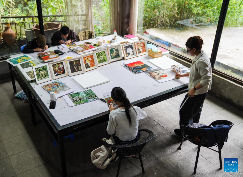 Estudiantes crean obras de impresión xilográfica en una base de enseñanza y práctica de impresión xilográfica Jueban en la Universidad de Pu'er, ciudad de Pu'er, provincia de Yunnan, en el suroeste de China, el 22 de octubre de 2025. (Xinhua/Zhou Jiayi).