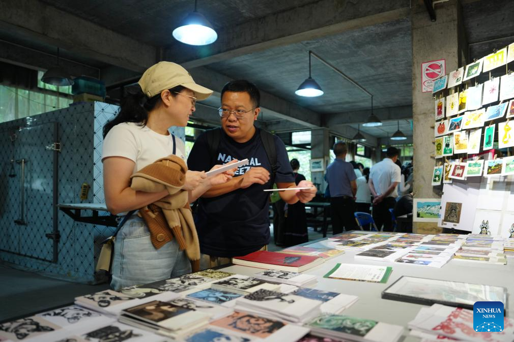 Turistas observan obras de impresión xilográfica en una base de enseñanza y práctica de impresión xilográfica Jueban en la Universidad de Pu'er, el 22 de octubre de 2025. (Xinhua/Chen Xinbo).