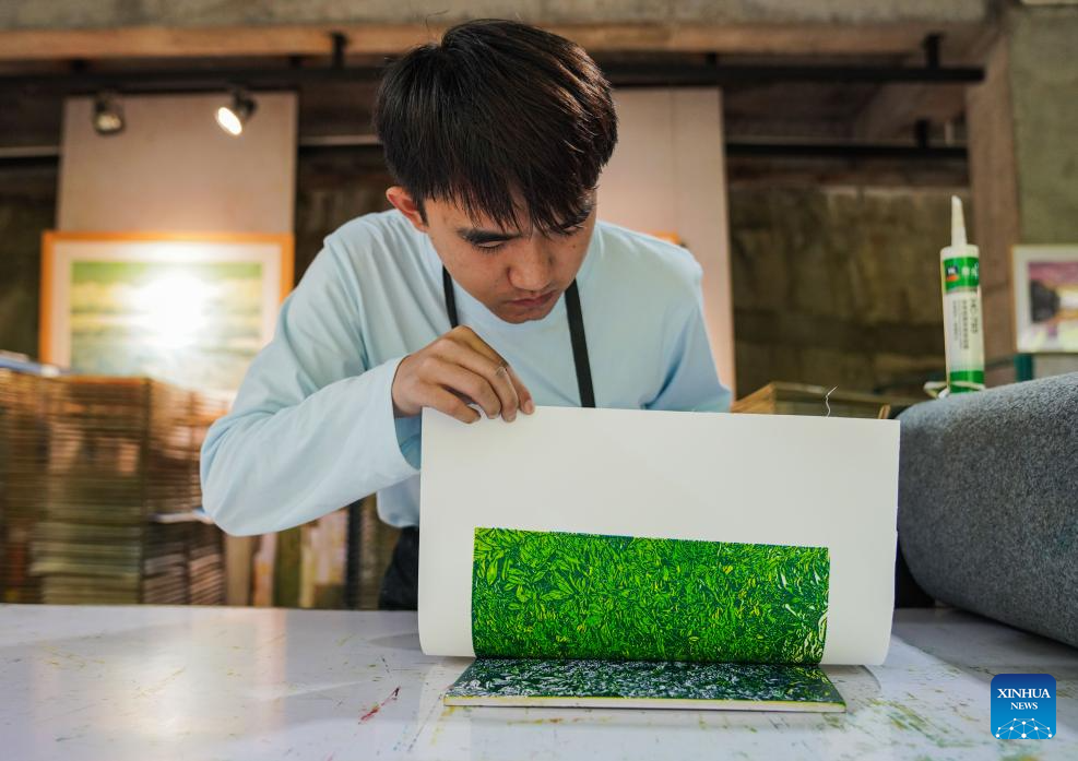 Un estudiante revisa una obra de impresión xilográfica en una base de enseñanza y práctica de impresión xilográfica Jueban en la Universidad de Pu'er, el 22 de octubre de 2025. (Xinhua/Chen Xinbo).
