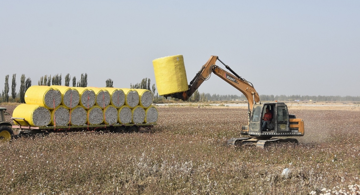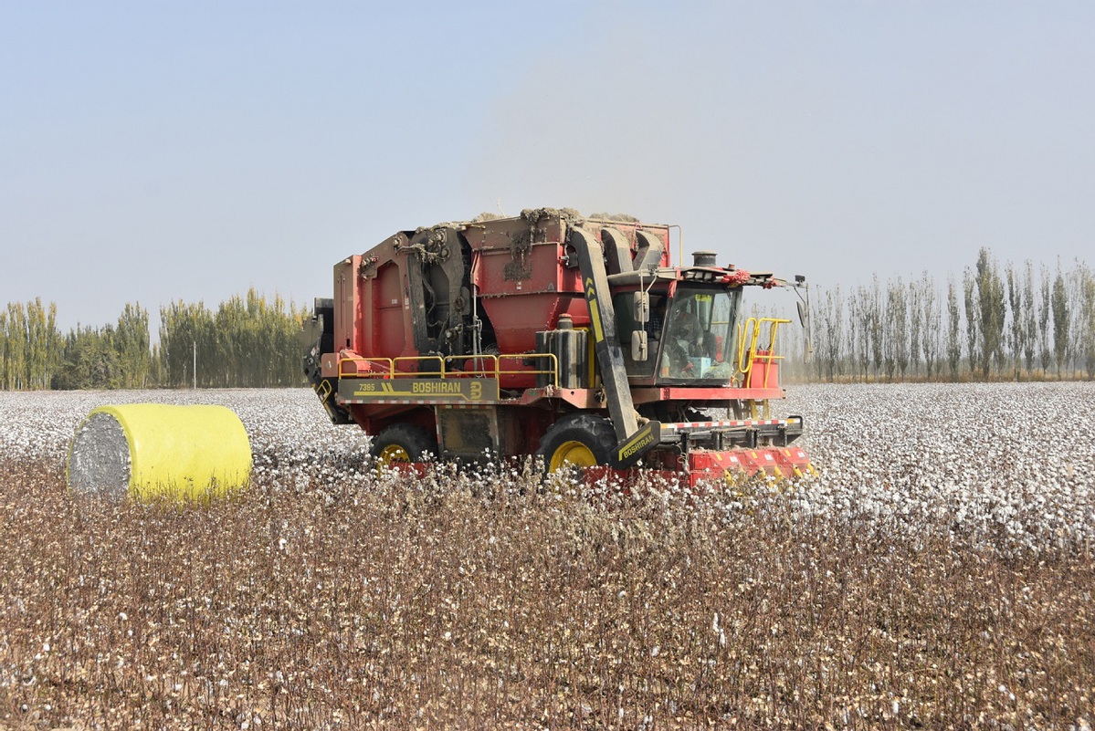 Una cosechadora en un campo de algodón del distrito de Xayar, Aksu, región autónoma uigur de Xinjiang, al noroeste de China, 21 de octubre de 2025. La temporada de cosecha del algodón ha iniciado en Xayar. [Xinhua]