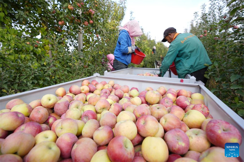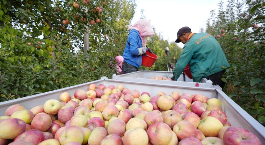Agricultores cosechan manzanas en una plantación del distrito de Shapotou en Zhongwei, en la región autónoma de la etnia Hui de Ningxia, noroeste de China, el 25 de octubre de 2025. El distrito de Shapotou ha desarrollado activamente su industria manzanera mediante el cultivo de nuevas variedades de manzanas, la mejora de la fertilidad del suelo, la promoción de nuevas tecnologías y la facilitación de la integración de la producción y la comercialización. La superficie de cultivo de manzanos en la región ha alcanzado las 79.000 mu (aproximadamente 5.266,67 hectáreas) con un valor de producción integral que supera los 800 millones de yuanes (aproximadamente 112,5 millones de dólares estadounidenses). (Xinhua/Wang Peng).