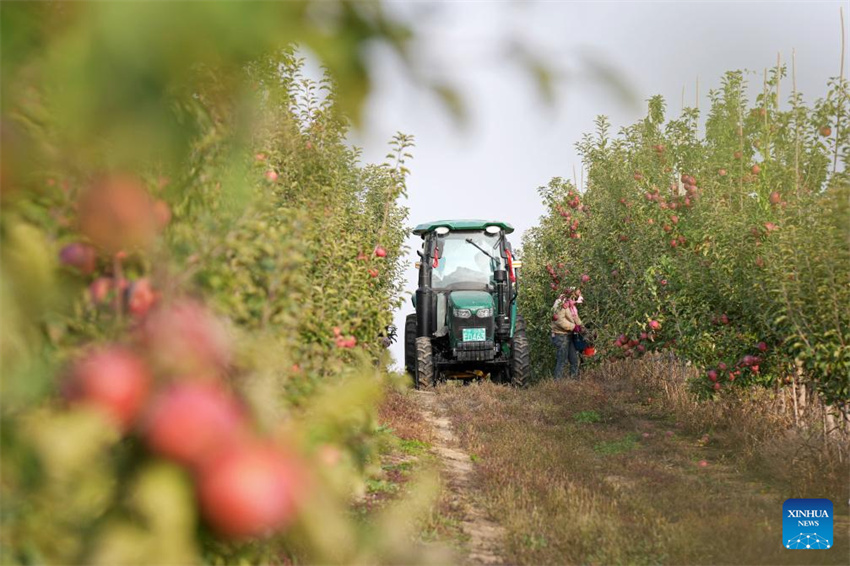 Una agricultora recolecta manzanas en una plantación del distrito de Shapotou en Zhongwei, región autónoma de la etnia Hui de Ningxia, el 25 de octubre de 2025. (Xinhua/Wang Peng).
