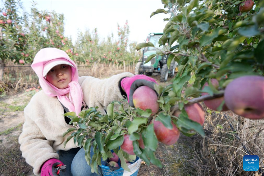 Una agricultora recolecta manzanas en una plantación del distrito de Shapotou en Zhongwei, región autónoma de la etnia Hui de Ningxia, el 25 de octubre de 2025. (Xinhua/Wang Peng).