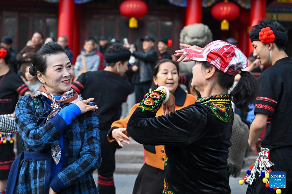 Turistas y ciudadanas interactúan con artistas de una compañía de danza y ópera de Yunnan durante un evento flash mob en el parque Renmin de Urumqi, el 27 de octubre de 2025. (Xinhua/Ding Lei).