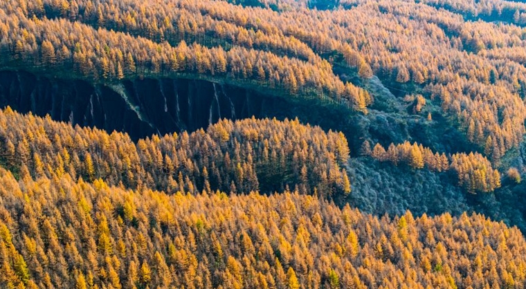 Una fotografía aérea tomada con un dron el 26 de octubre de 2025 captura el paisaje otoñal de la montaña Liupanshan en la ciudad de Guyuan, región autónoma de la etnia Hui de Ningxia, en el noroeste de China. (Xinhua/Wang Peng).