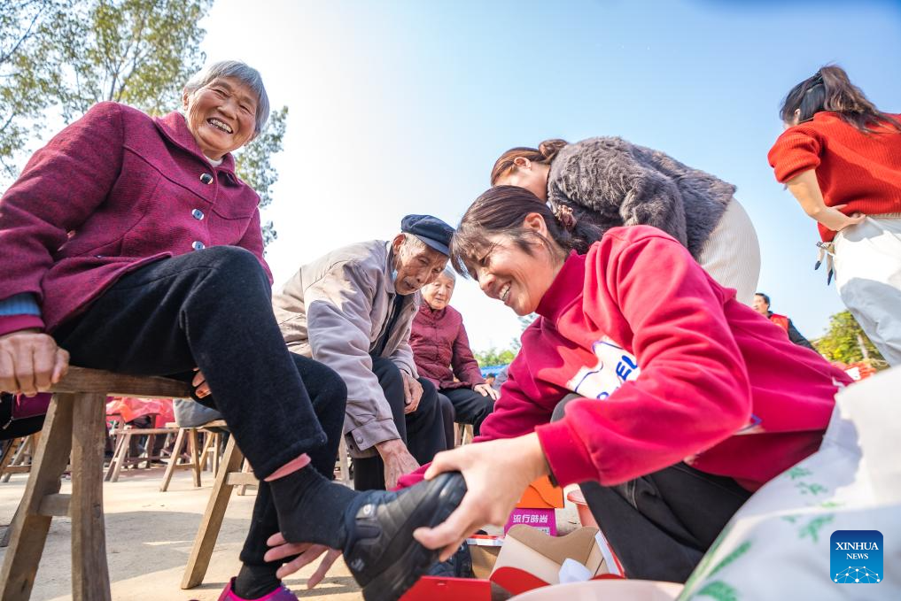 Un miembro del personal ayuda a una anciana a ponerse un par de zapatos donados en la aldea de Baimiao, ciudad de Zhumadian, provincia de Henan, en el centro de China, el 28 de octubre de 2025. (Foto de Zhao Yongtao/Xinhua).