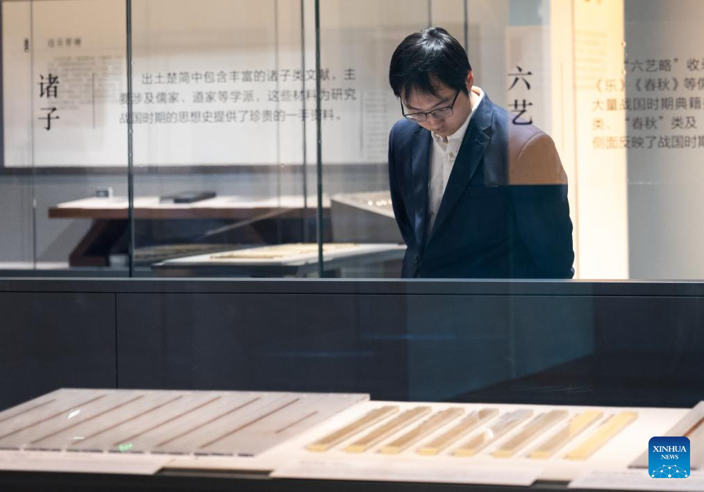 Un hombre contempla obras exhibidas en la exposición «Antiguas tablillas de bambú y madera de China» en el Museo Provincial de Hubei, en Wuhan, provincia de Hubei, el 28 de octubre de 2025. (Xinhua/Xiao Yijiu).