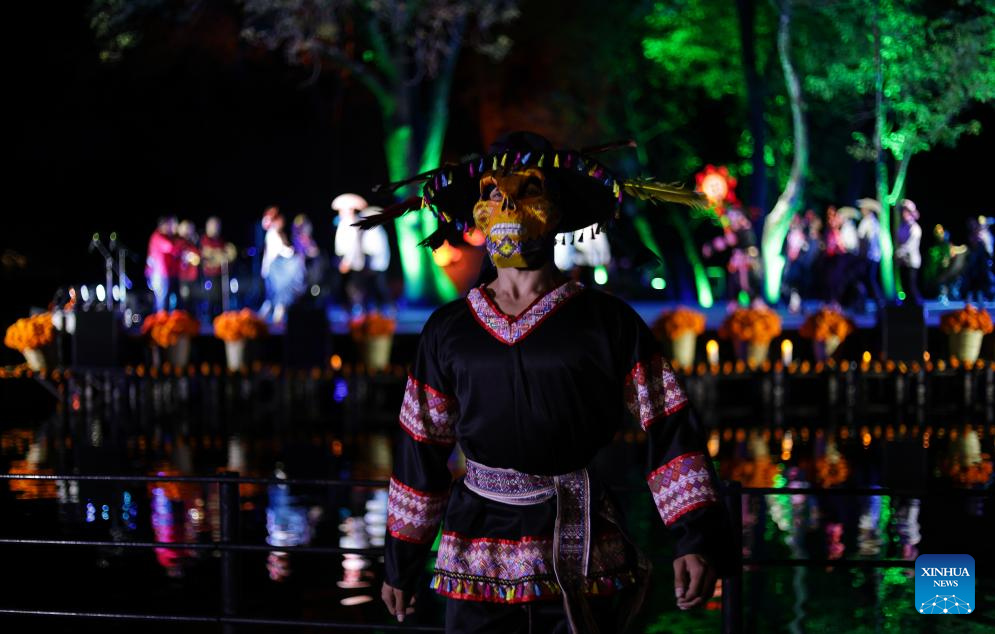 Imagen del 28 de octubre de 2025 de un bailarín del Ballet Folklórico de México de Amalia Hernández participando en el ensayo del espectáculo "La muerte en México está más viva que nunca" que se llevará a cabo en el marco de la festividad del Día de Muertos, en la isleta del Lago Menor del Bosque de Chapultepec, en la Ciudad de México, capital de México. (Xinhua/Francisco Cañedo)