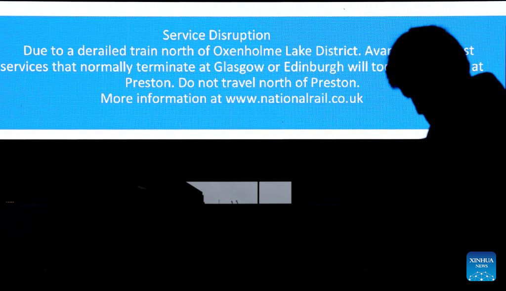 Un hombre permanece junto a una pantalla que muestra información sobre los cambios en los servicios ferroviarios, en la Estación Euston, en Londres, Reino Unido, el 3 de noviembre de 2025. Un tren con 87 pasajeros a bordo se descarriló el lunes en el noroeste de Inglaterra, lo que provocó la interrupción de servicios ferroviarios, informaron medios de comunicación locales. (Xinhua/Li Ying)
