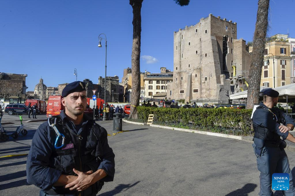 Policías y bomberos trabajan en el sitio después de que una sección de la Torre dei Conti, una torre medieval actualmente en restauración, se derrumbara, en el centro de Roma, Italia, el 3 de noviembre de 2025. Una sección de la Torre dei Conti se derrumbó el lunes, hiriendo a cuatro trabajadores de la construcción y desencadenando una operación de rescate de emergencia, informaron medios locales. (Xinhua/Alberto Lingria)