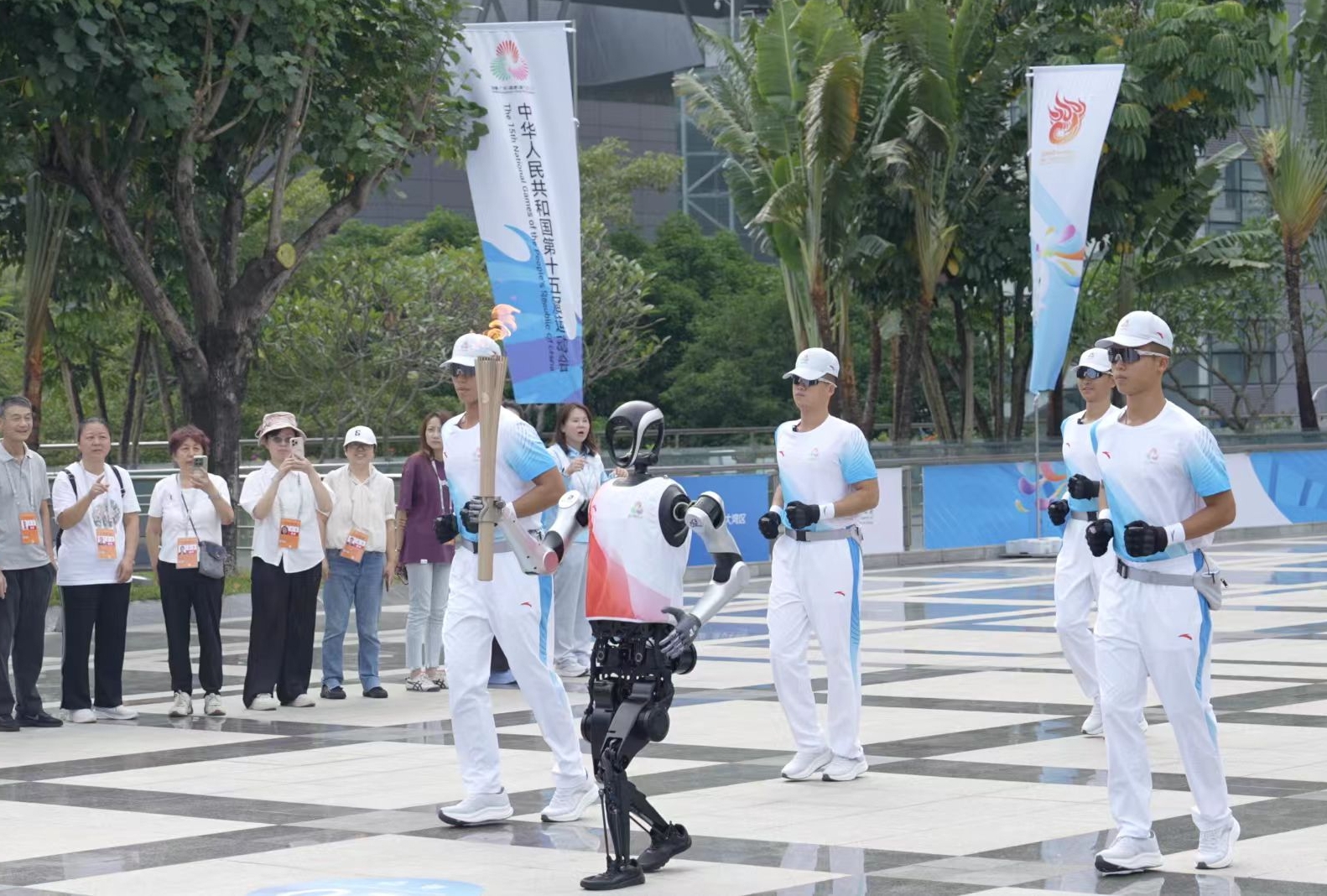 El robot blanco y negro fue «el portador de la antorcha cero». El primer día del relevo, Kuavo levantó las manos y corrió de manera natural y firme.