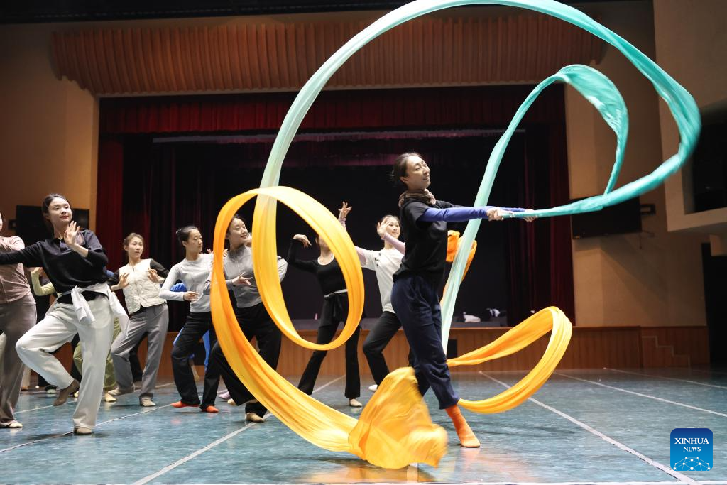 Imagen del 3 de noviembre de 2025 de bailarinas ensayando el drama de danza "Flores Llueven a lo largo de la Ruta de la Seda", en Lanzhou, en la provincia de Gansu, en el noroeste de China. La danza Dunhuang se refiere a un estilo de danza que tiene como objetivo dar vida a las figuras icónicas representadas en los antiguos murales de las Grutas de Mogao. Inspirándose en temas históricos, artistas contemporáneos han creado obras maestras de música y danza, como el clásico drama de danza "Flores Llueven a lo largo de la Ruta de la Seda", y "Bodhisattva de las Mil Manos". (Xinhua/Chen Bin)