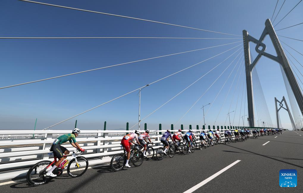 Ciclistas compiten a través del Puente Hong Kong-Zhuhai-Macao durante la carrera masculina de ciclismo en ruta de los XV Juegos Nacionales de China, en la provincia de Guangdong, en el sur de China, el 8 de noviembre de 2025. (Xinhua/Mao Siqian)