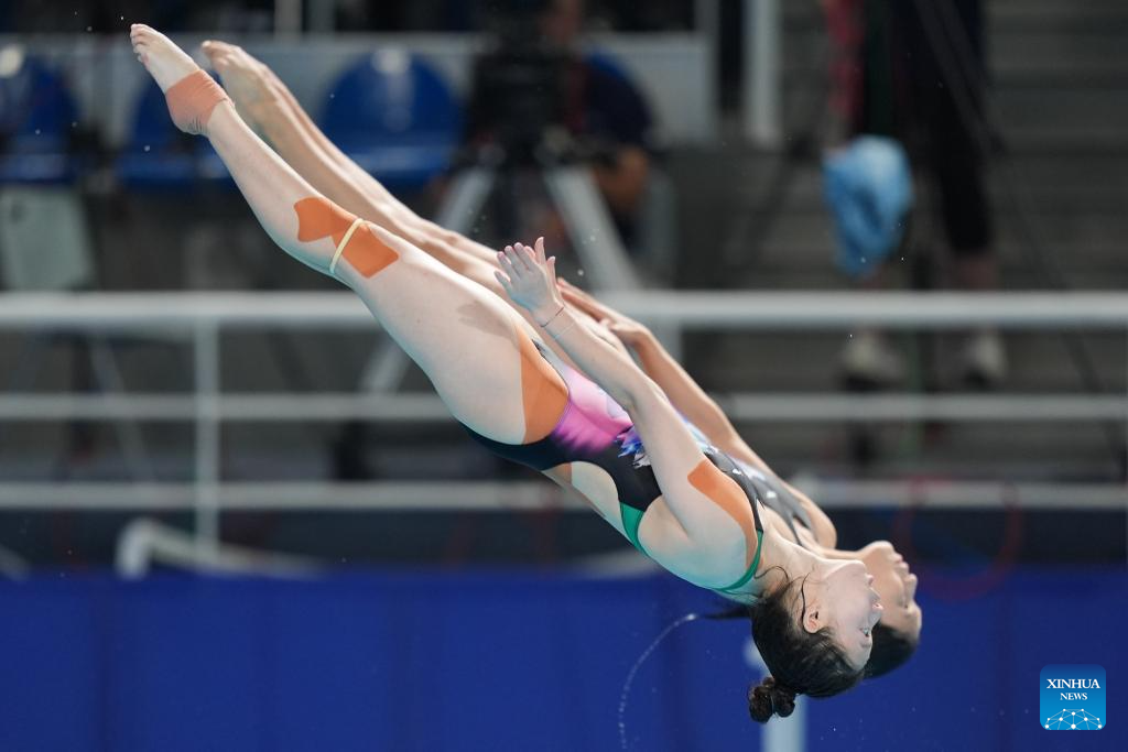 Imagen del 7 de noviembre de 2025 de Miao Yulin/Tang Xiaojie, de Sichuan, compitiendo durante la final femenina de trampolín sincronizado de 3m de clavados en los XV Juegos Nacionales de China, en Guangzhou, en la provincia de Guangdong, en el sur de China. (Xinhua/Du Yu)