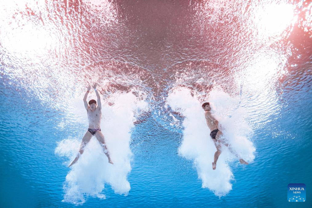 Imagen del 7 de noviembre de 2025 de Huang Zigan/Yang Ling, de Tianjin, compitiendo durante la final masculina de plataforma sincronizada de 10m de clavados en los XV Juegos Nacionales de China, en Guangzhou, en la provincia de Guangdong, en el sur de China. (Xinhua/Du Yu)