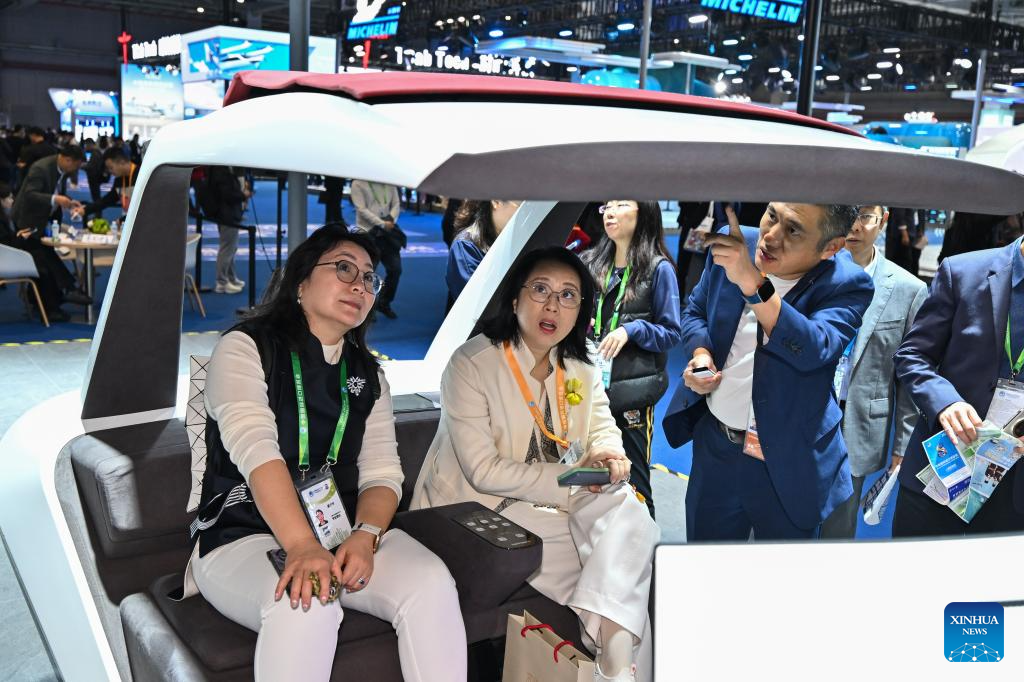 Visitantes aprenden acerca de una cabina inteligente en el estand de Webasto en el área de exposición de Automóviles y Movilidad Inteligente de la VIII Exposición Internacional de Importaciones de China (CIIE, por sus siglas en inglés), en Shanghai, en el este de China, el 8 de noviembre de 2025. La VIII CIIE presentó una gama de nuevos productos de movilidad y tecnologías innovadoras, desplegando una visión diversificada y multidimensional del transporte del futuro. (Xinhua/Cai Xiangxin)