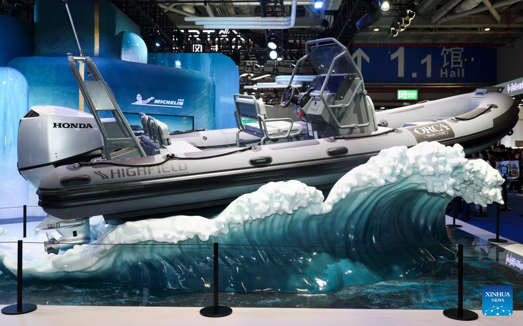 Una embarcación neumática rígida con revestimiento compuesto es vista en el estand de Michelin en el área de exposición de Automóviles y Movilidad Inteligente de la VIII Exposición Internacional de Importaciones de China (CIIE, por sus siglas en inglés), en Shanghai, en el este de China, el 8 de noviembre de 2025. La VIII CIIE presentó una gama de nuevos productos de movilidad y tecnologías innovadoras, desplegando una visión diversificada y multidimensional del transporte del futuro. (Xinhua/Wang Xiang)