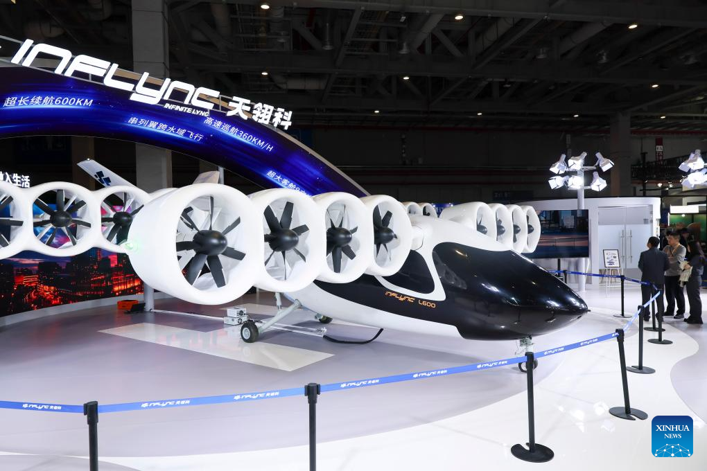 Una aeronave eléctrica de despegue y aterrizaje vertical es vista en el estand de Inflync en el área de exposición de Automóviles y Movilidad Inteligente de la VIII Exposición Internacional de Importaciones de China (CIIE, por sus siglas en inglés), en Shanghai, en el este de China, el 8 de noviembre de 2025. La VIII CIIE presentó una gama de nuevos productos de movilidad y tecnologías innovadoras, desplegando una visión diversificada y multidimensional del transporte del futuro. (Xinhua/Wang Xiang)