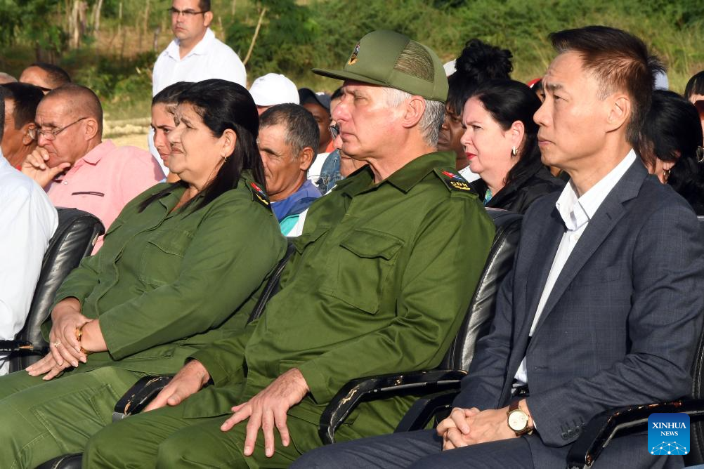 El presidente cubano, Miguel Díaz-Canel (c-frente), y el embajador de China en Cuba, Hua Xin (d-frente), asisten a la inauguración del nuevo parque fotovoltaico con asistencia china, en la provincia de Artemisa, en el oeste de Cuba, el 12 de noviembre de 2025. Un nuevo parque fotovoltaico con asistencia china fue inaugurado el miércoles en la provincia cubana de Artemisa, a unos 50 km al oeste de La Habana. (Xinhua/Joaquín Hernández)