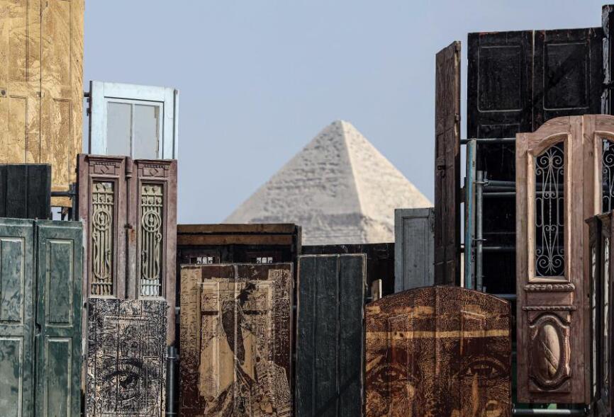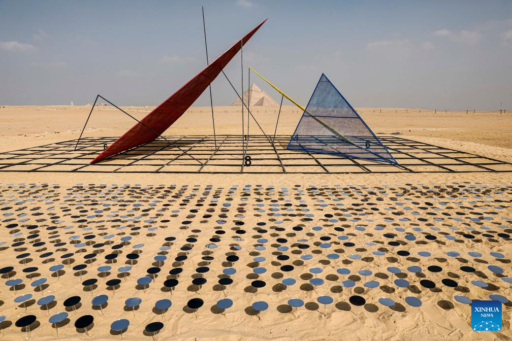 Una instalación artística es exhibida durante la exposición internacional de arte "Por Siempre es Ahora" en el punto escénico de las Pirámides de Giza, en Giza, Egipto, el 11 de noviembre de 2025. La quinta edición de la exposición internacional de arte "Por Siempre es Ahora" comenzó el martes en el área del punto escénico de las Pirámides de Giza de Egipto, presentando 10 obras de artistas de diferentes países. (Xinhua/Ahmed Gomaa)
