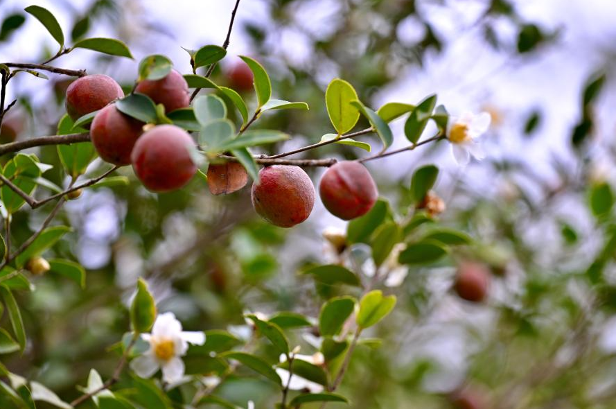 Los frutos de la camelia del té oleaginoso entran en temporada de cosecha en el distrito de Yongtai, Fujian, China