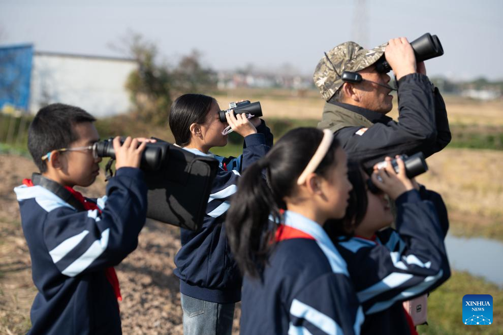 Estudiantes de la escuela primaria Maotan observan aves bajo la guía de un voluntario de conservación de aves silvestres en la reserva natural provincial de Shibasuo, en Chizhou, provincia de Anhui, este de China, 18 de noviembre de 2025. (Xinhua/Zhang Duan)
