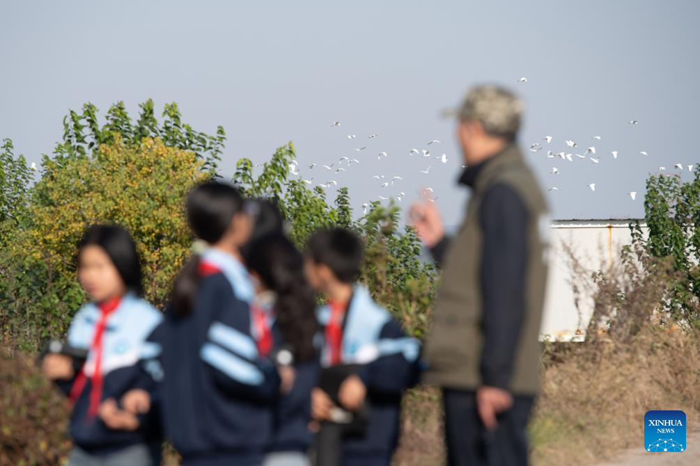 El vuelo de una bandada de garzas de fondo, mientras los estudiantes de la escuela primaria Maotan observan las aves con la guía de un voluntario de conservación de aves silvestres en la reserva natural provincial de Shibasuo, en Chizhou, provincia de Anhui, este de China, 18 de noviembre de 2025. (Xinhua/Zhang Duan)