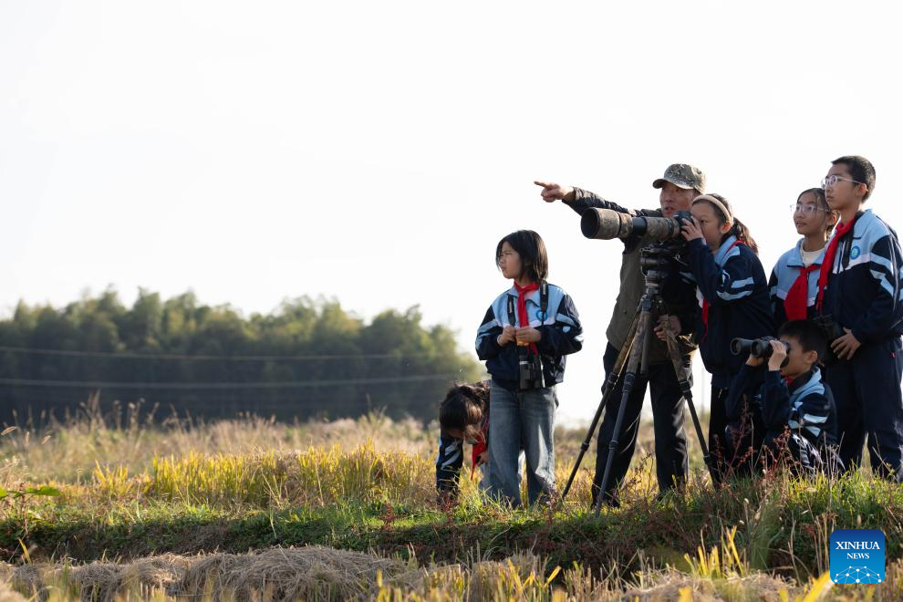 Alumnos de la escuela primaria Maotan graban a las aves con una cámara bajo la guía de un voluntario de conservación de aves silvestres en la reserva natural provincial de Shibasuo, en Chizhou, provincia de Anhui, este de China, 18 de noviembre de 2025. (Xinhua/Zhang Duan)
