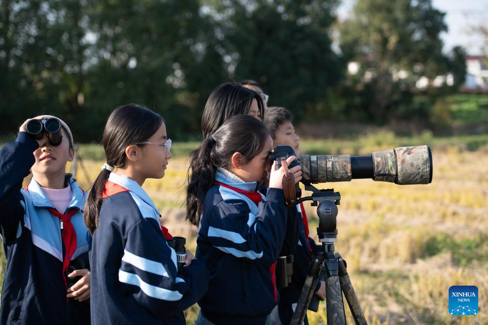 Alumnos de la escuela primaria Maotan graban a las aves con una cámara bajo la guía de un voluntario de conservación de aves silvestres en la reserva natural provincial de Shibasuo, en Chizhou, provincia de Anhui, este de China, 18 de noviembre de 2025. (Xinhua/Zhang Duan)