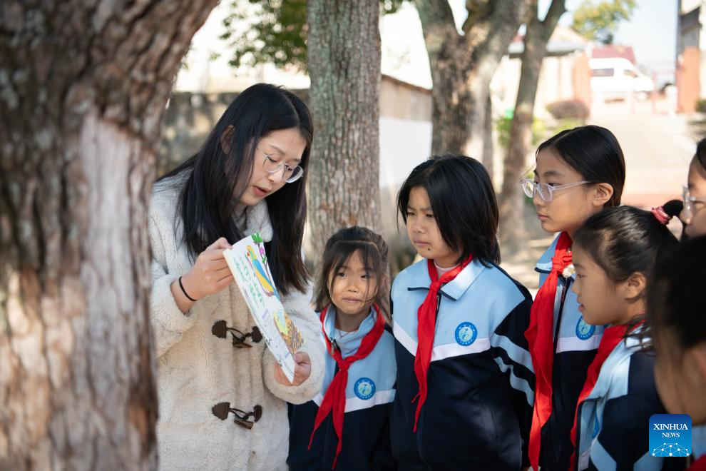 Lección sobre protección de aves en la escuela primaria Maotan, en el distrito de Guichi, Chizhou, provincia de Anhui, este de China, 18 de noviembre de 2025. (Xinhua/Zhang Duan)