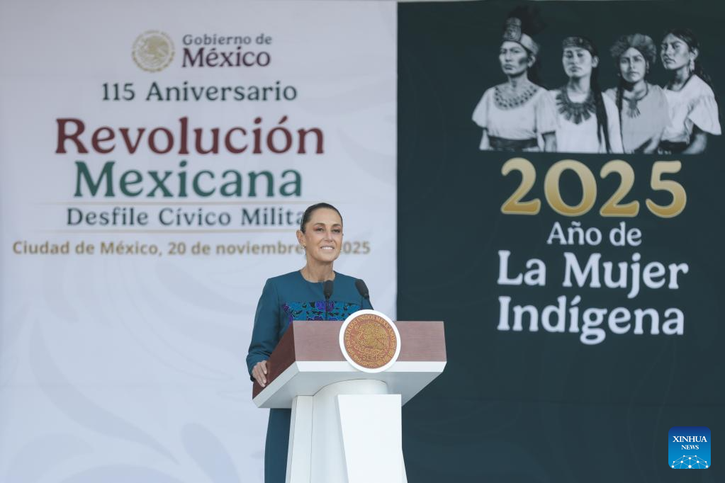 La presidenta mexicana, Claudia Sheinbaum, habla durante el Desfile Cívico Militar en conmemoración del 115 Aniversario del inicio de la Revolución Mexicana, en la Plaza de la Constitución, en la Ciudad de México, capital de México, el 20 de noviembre de 2025. Sheinbaum destacó el jueves que la transformación histórica iniciada en el país en 1910, año de inicio de la Revolución Mexicana, sigue vigente en la defensa de la soberanía nacional, la justicia social y el rechazo a cualquier forma de injerencia extranjera. (Xinhua/Francisco Cañedo)