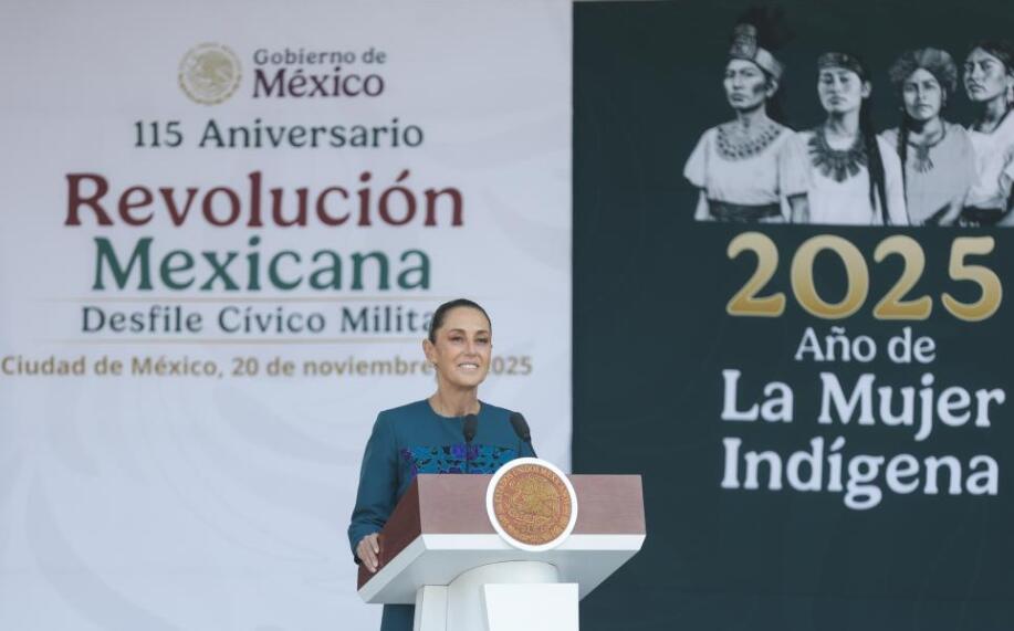 La presidenta mexicana, Claudia Sheinbaum, habla durante el Desfile Cívico Militar en conmemoración del 115 Aniversario del inicio de la Revolución Mexicana, en la Plaza de la Constitución, en la Ciudad de México, capital de México, el 20 de noviembre de 2025. Sheinbaum destacó el jueves que la transformación histórica iniciada en el país en 1910, año de inicio de la Revolución Mexicana, sigue vigente en la defensa de la soberanía nacional, la justicia social y el rechazo a cualquier forma de injerencia extranjera. (Xinhua/Francisco Cañedo)
