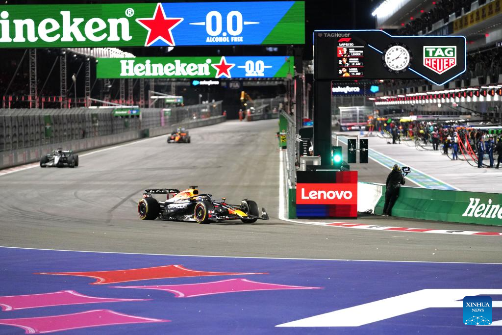 Imagen del 22 de noviembre de 2025 del piloto neerlandés de la escudería Red Bull, Max Verstappen (frente), compitiendo durante el Gran Premio de Las Vegas 2025 de Fórmula Uno, en el Circuito de Las Vegas, en Las Vegas, Estados Unidos. (Xinhua/Wu Xiaoling)